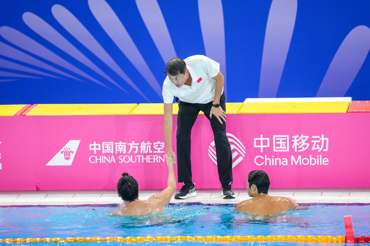 10月25日,湖南队主教练龚大立(上)在比赛结束后与球员握手。新华社记者 陈思汗 摄