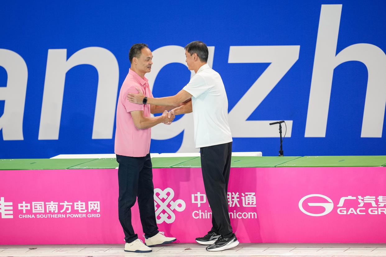 10月25日,广东队主教练陈卫汉(左)与湖南队主教练龚大立在比赛后致意。新华社记者 陈思汗 摄