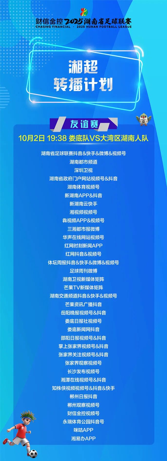 最终,邵阳队1比1战平大湾区湖南人队。明日(10月2日)19:38,大湾区湖南人队将转战娄底,与湘超娄底队进行一场友谊赛,转播平台如下。