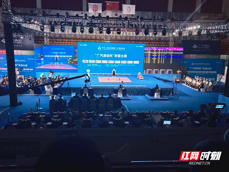 助威团成员拍下的“十五运”举重女子49公斤级比赛现场。
