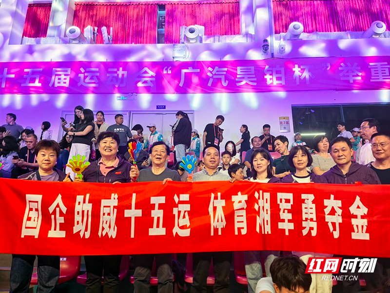 助威团展示“国企助威十五运 体育湘军勇夺金”的横幅。