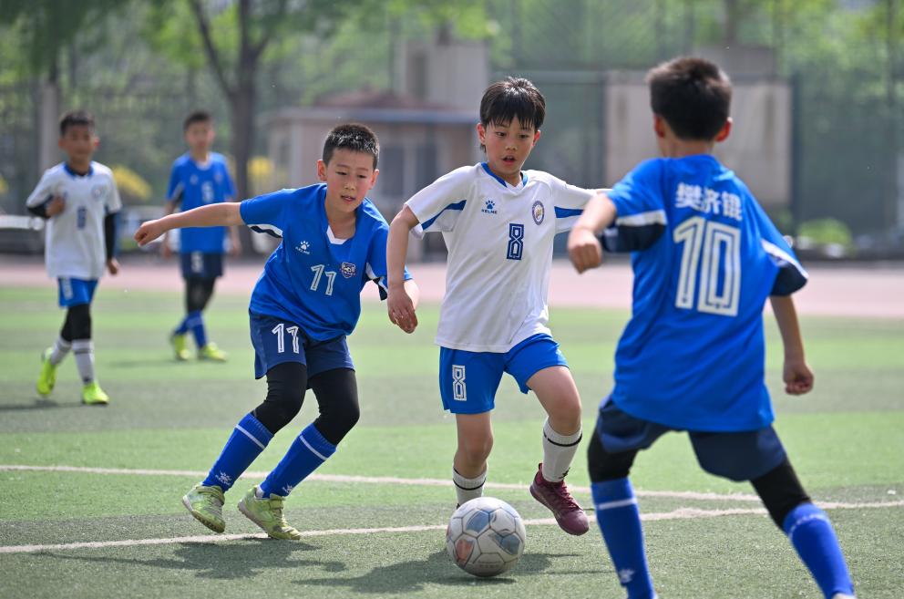 4月16日,在天津市河西区举行的一场校园足球比赛。新华社记者 孙凡越 摄