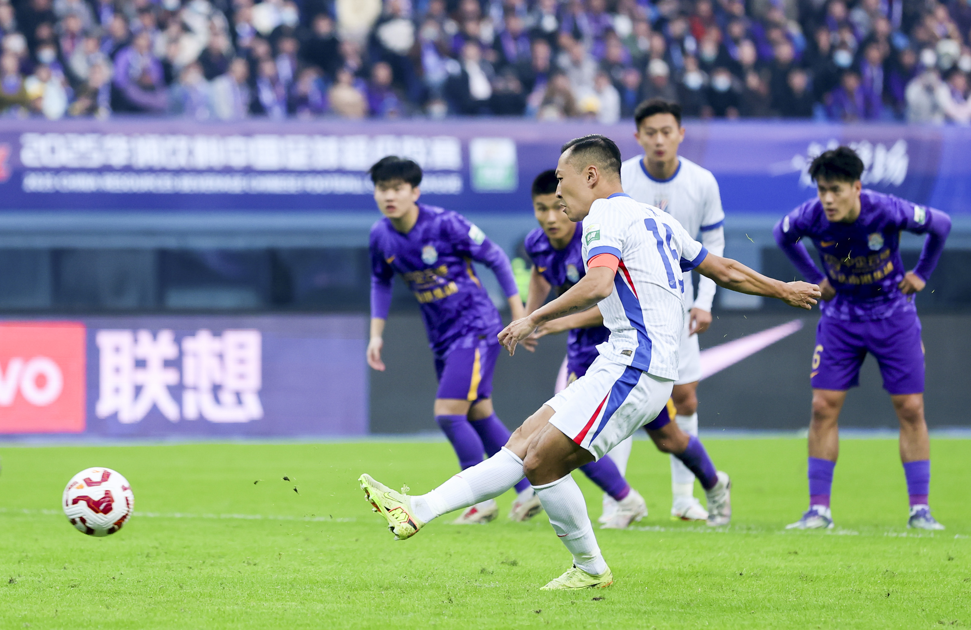 11月22日,上海申花队球员吴曦(前)点球破门。当日,在天津举行的2025赛季中国足球超级联赛第30轮比赛中,上海申花队客场3比1战胜天津津门虎队。新华社记者 孙凡越 摄
