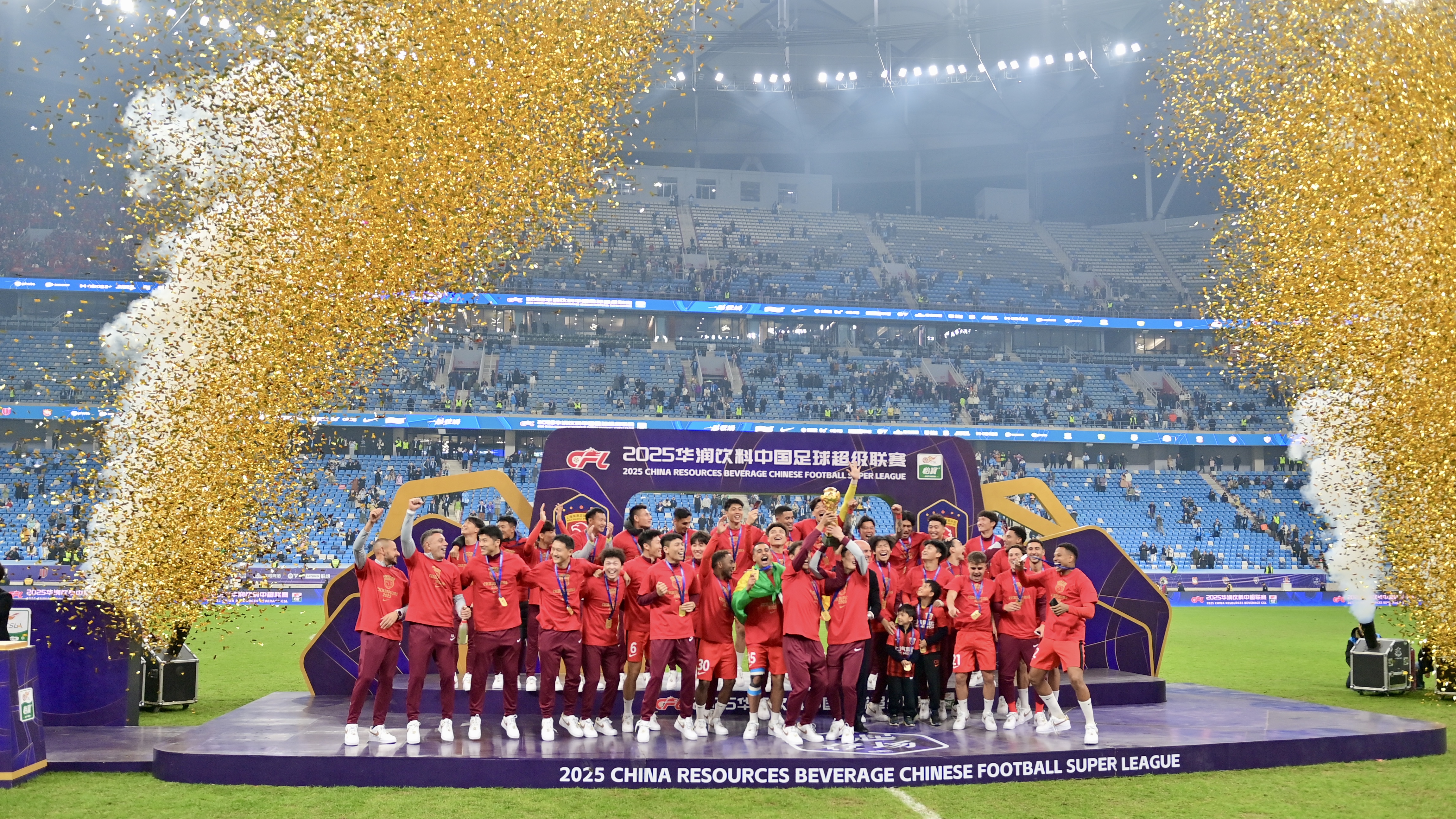 11月22日,上海海港队在颁奖仪式上庆祝夺冠。当日,在辽宁大连举行的2025赛季中国足球协会超级联赛第30轮比赛中,上海海港队客场1比0战胜大连英博队,获得本赛季中超联赛冠军。新华社记者 吴青昊 摄