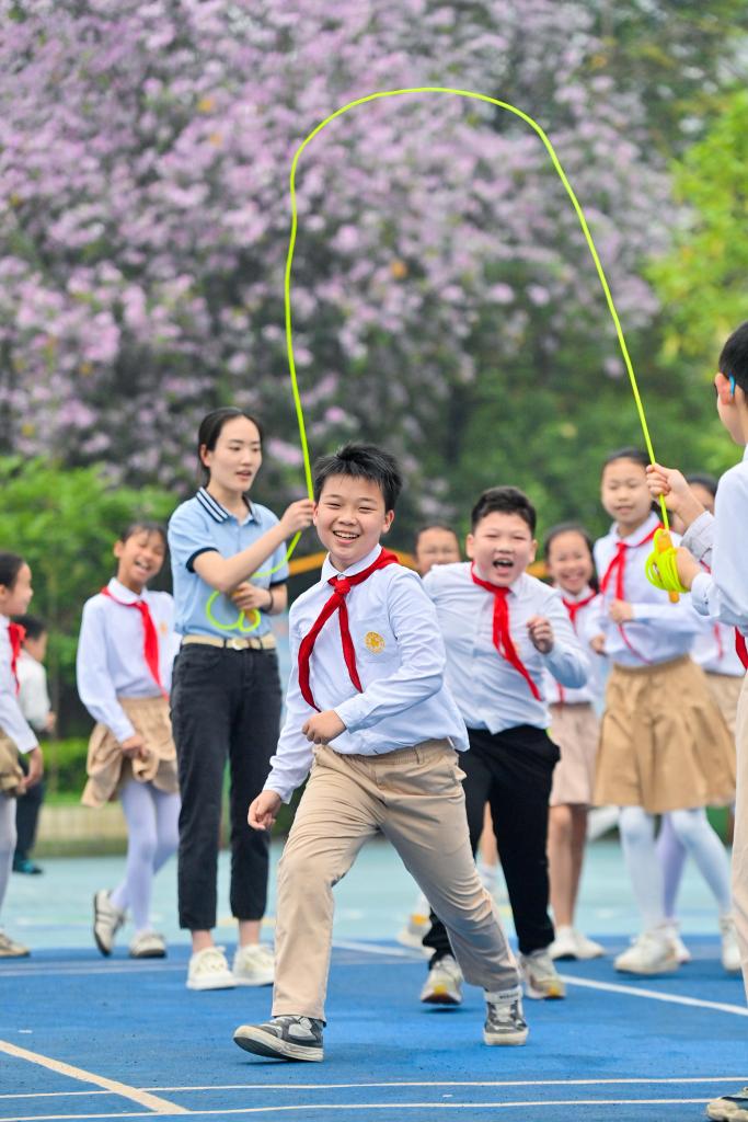 4月10日,广西柳州市潭中路第二小学的学生们在大课间跳绳。新华社记者 黄孝邦 摄