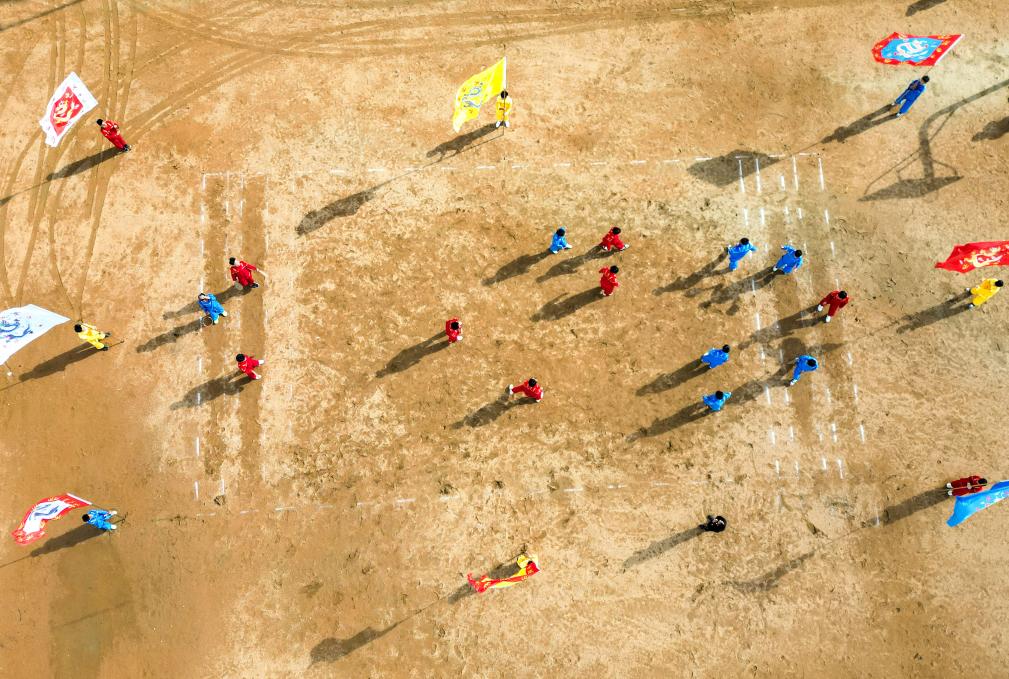 9月16日,吉林省吉林市乌拉街满族中学学生在操场进行珍珠球比赛(无人机照片)。新华社记者 颜麟蕴 摄