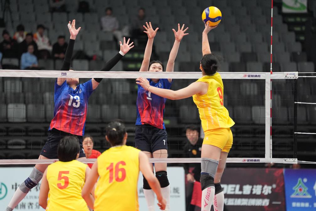 2024年11月27日,江苏队球员滕蔓绮(中)、李涵宇(左)在第一届青少年三大球运动会女子排球决赛中拦网。新华社记者 薛宇舸 摄