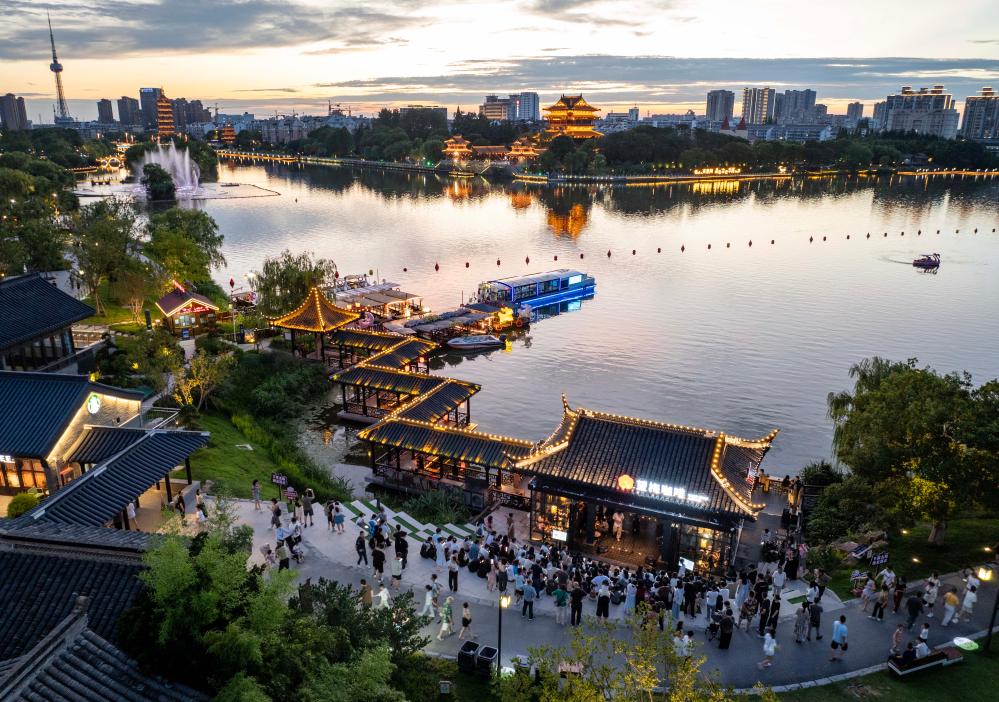 6月28日,人们在泰州市海陵区桃园景区游玩(无人机照片)。据悉,在江苏省城市足球联赛泰州队主场比赛期间,联赛各场次比赛购票观众和客场球队城市市民,均可享受泰州48家旅游景区免费入园、免费品尝泰州早茶,以及停车、住宿、购物等多项优惠。本次跟着“苏超”逛泰州活动整合住宿、餐饮、文旅等多元业态,推出多项创新举措,借赛事东风,促文旅消费。新华社发(汤德宏 摄)