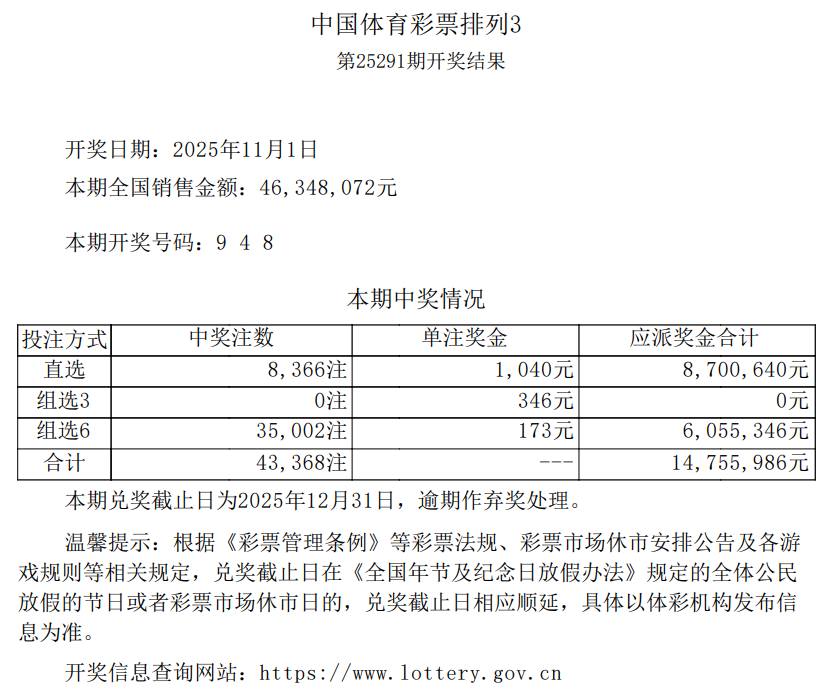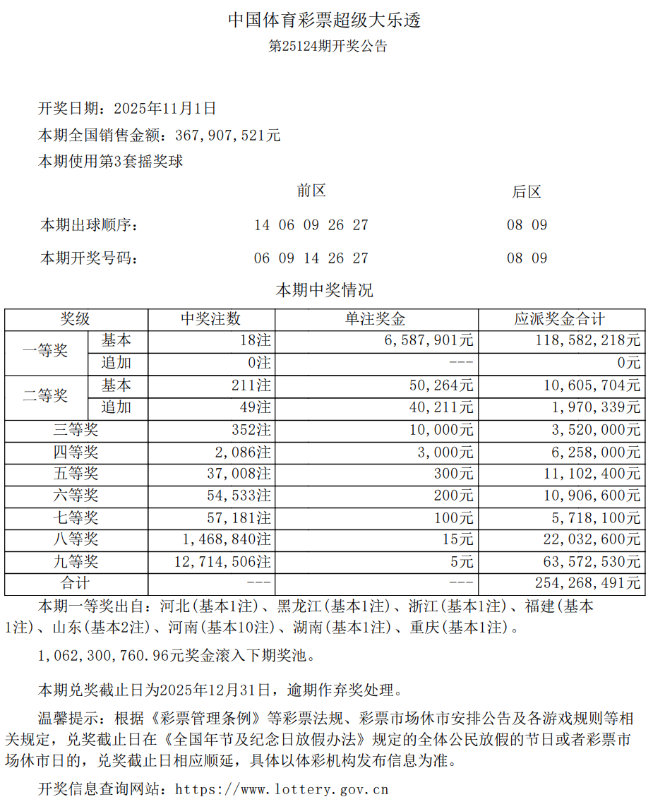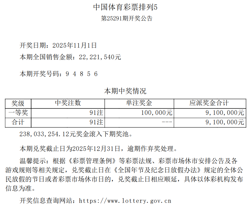 中国体育彩票2025年11月1日开奖信息