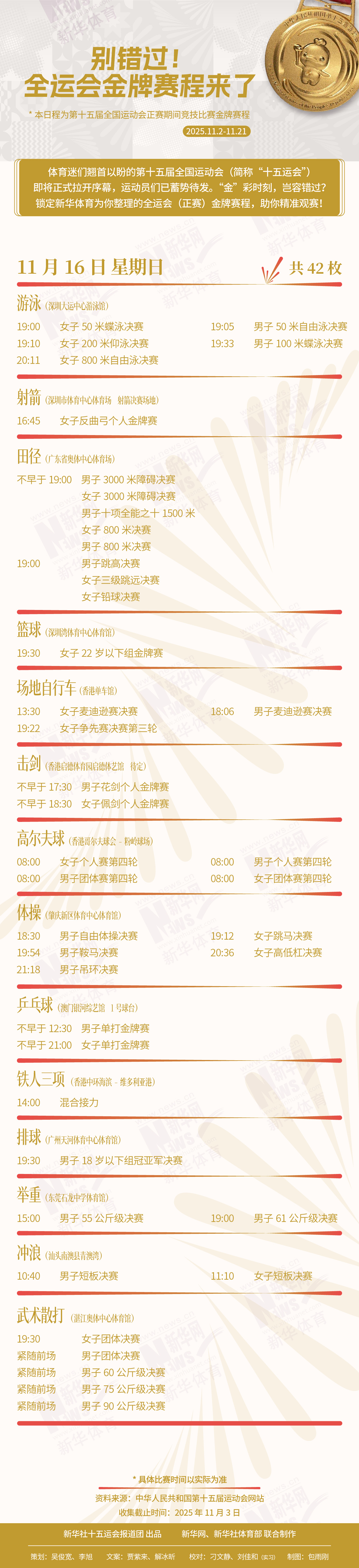 时刻新闻 —分享— 体育迷们翘首以盼的第十五届全国运动会(简称“十五运会”)即将正式拉开序幕,运动员们已蓄势待发。“金”彩时刻,岂容错过?锁定新华体育为你整理的全运会(正赛)金牌赛程,助你精准观赛! 来源:新华社 编辑:符环宇