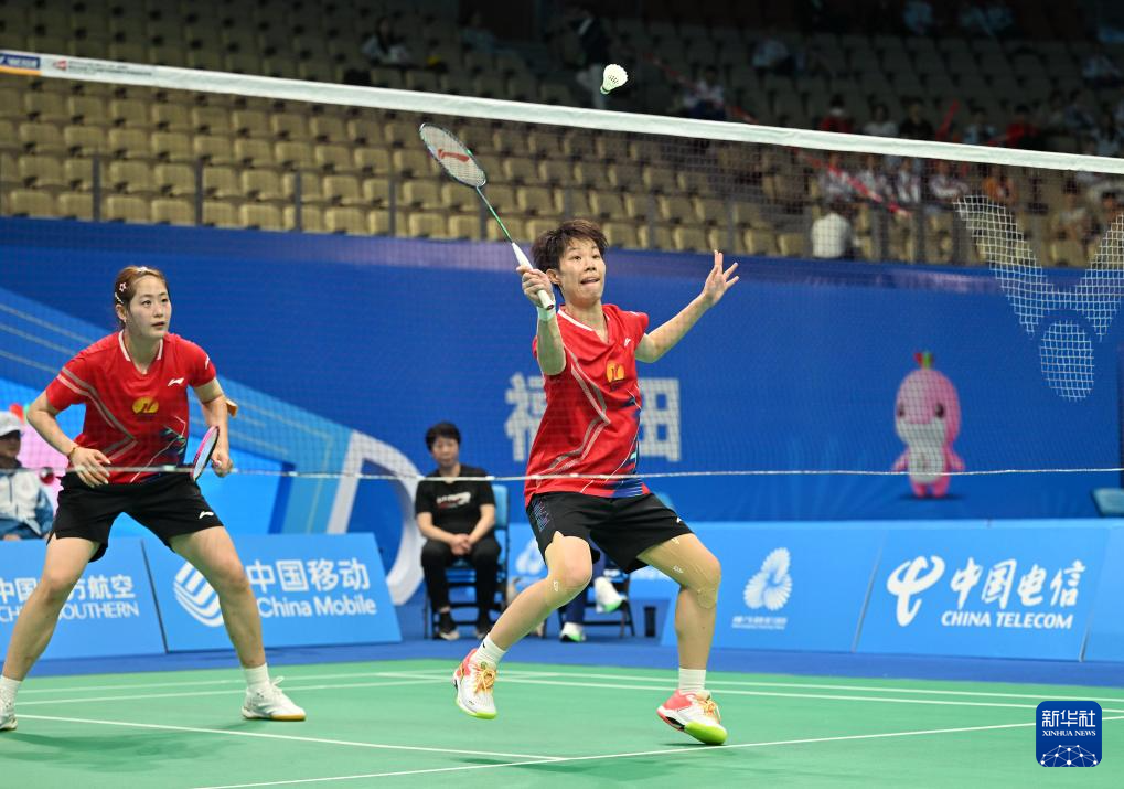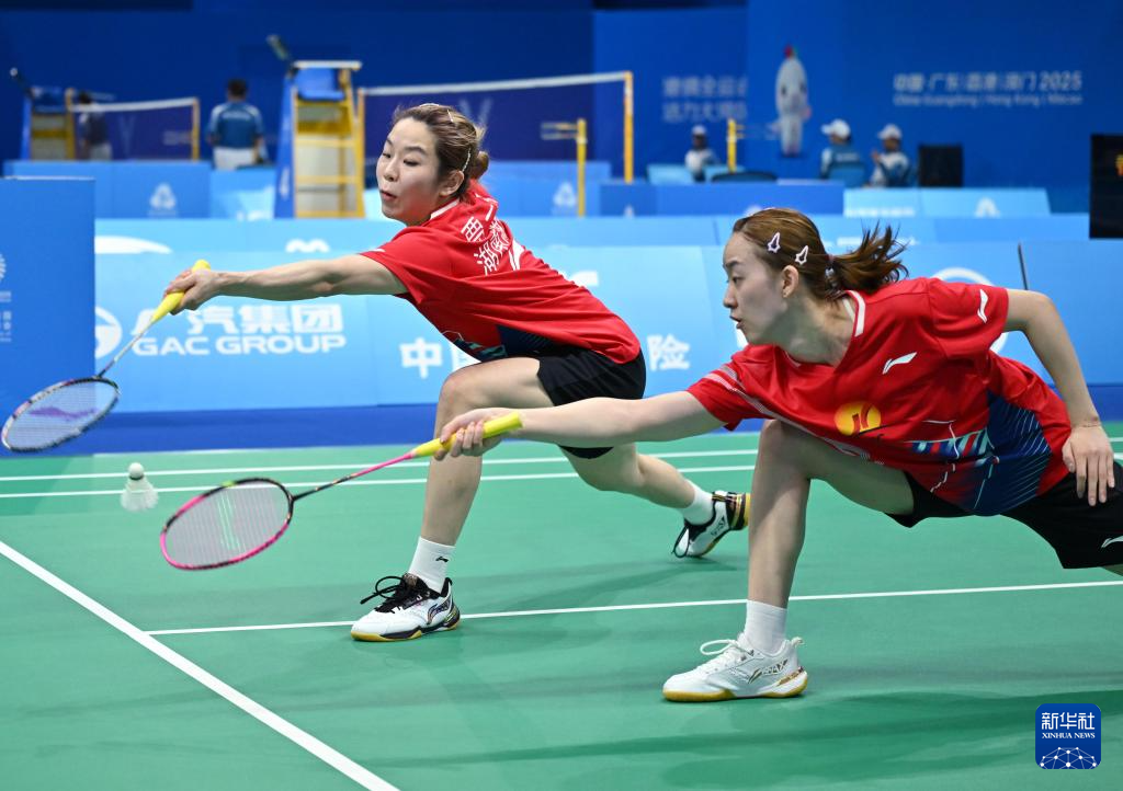 11月7日,湖南队组合贾一凡/张驰(右)在女双比赛中。她们2比0战胜香港队组合杨霈霖/杨雅婷。