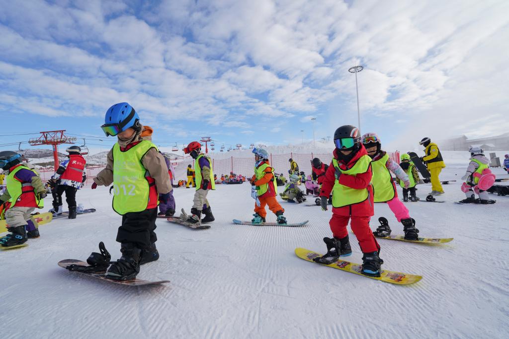 12月1日,学生在阿勒泰将军山国际滑雪度假区练习单板滑雪。新华社记者 阿曼 摄