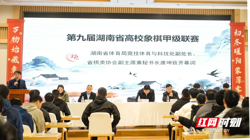 红网时刻新闻12月28日讯(记者 符洹雨 通讯员 郭豪豪)12月27日,第九届湖南省高校象棋甲级联赛在湖南信息学院拉开帷幕,共有11支高校队伍、66名选手参赛。湖南信息学院党委委员、学生工作部部长黎善江,湖南省体育局竞技体育与科技处副处长、湖南省棋类协会副主席兼秘书长唐坤,湖南省棋类协会副主席、长沙市象棋协会会长陈少林等人出席开幕式。