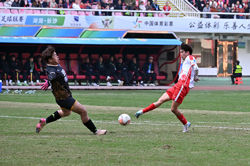 12月6日下午,湘超联赛结束了第13轮的角逐。图为谭想推射打破长沙VS常德比赛僵局。摄影/余劭劼(长沙晚报)